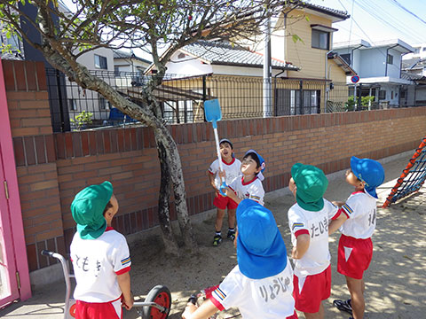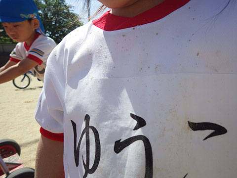 暖かくなり、水を使ったあそびも活発になりこのように体操服も汚れています