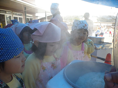 エビカニクス♪杵や臼、せいろなどの道具を学び、実際にみんなが食べる餅になる