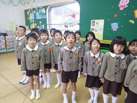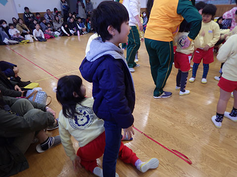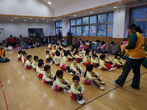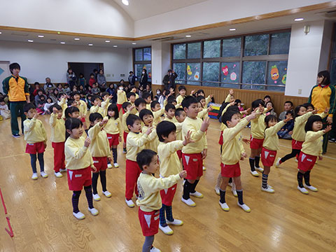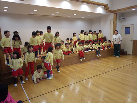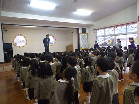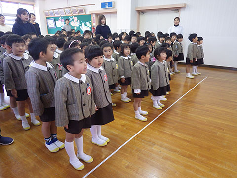 全園児、おゆうぎ室に集まって3学期の始業式!