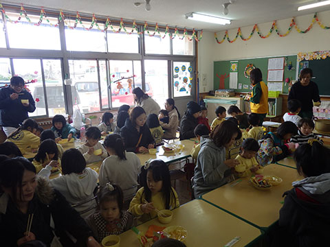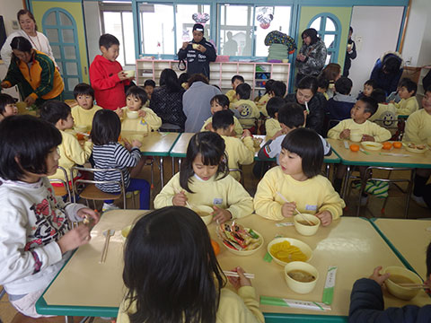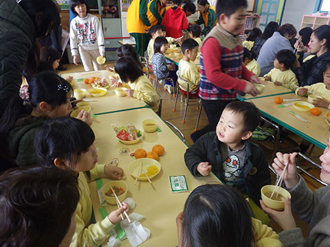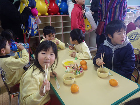 最後は、全員で教室へ入り温かい豚汁、お菓子、みかんでリラックス