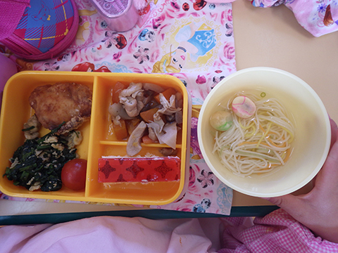 ひな祭りらしくかわいい手まり麩入りのそうめんに、
