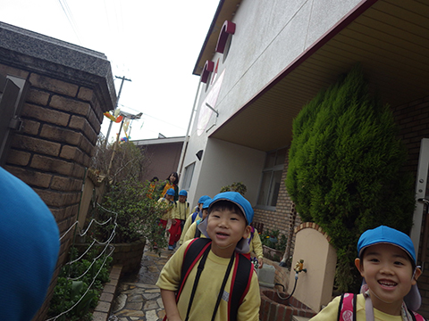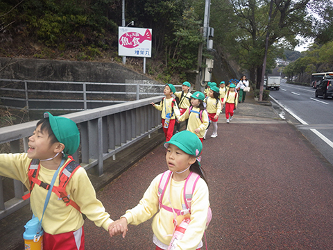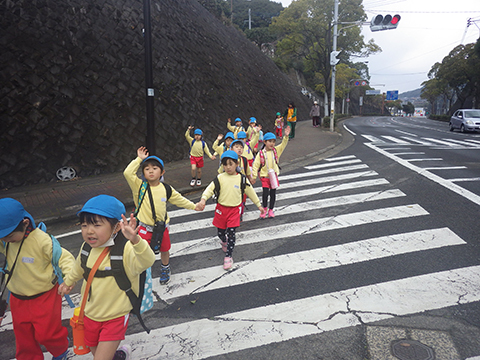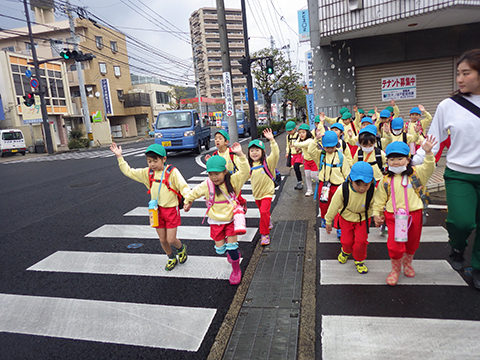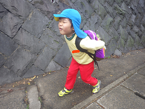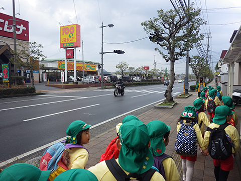 横断歩道、歩道橋を渡っているとあとから出発した年中少児の姿が