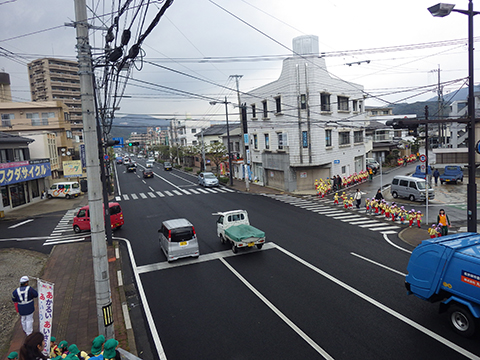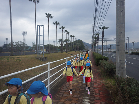 なが〜い直線に少し飽きてくる頃、東相浦幼稚園の年長児と合流。