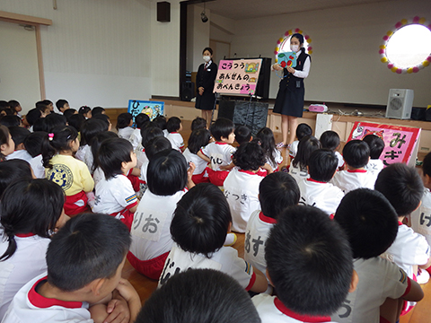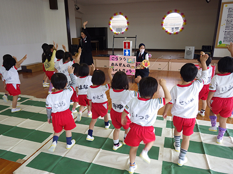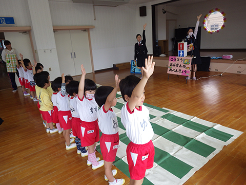 今日は全園児、おゆうぎ室に集まり交通安全教室をしました