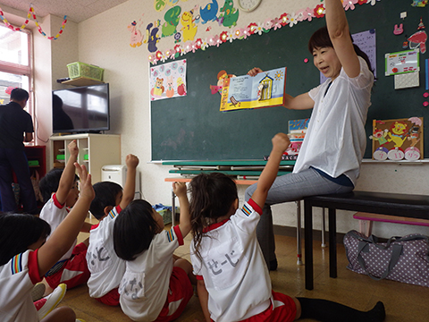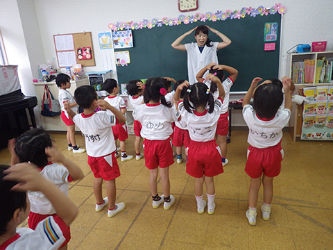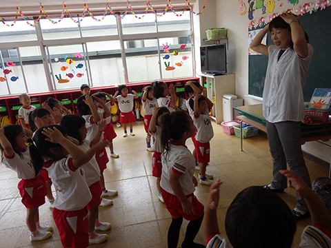 身体のパーツを指しながらリズムに合わせて踊ったり、