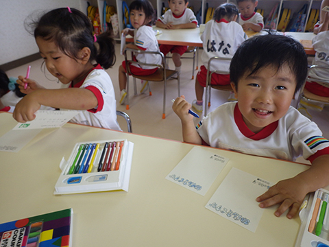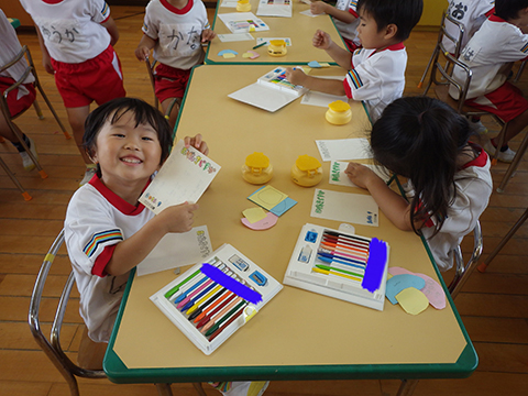 年少児がおじいちゃん、おばあちゃんへハガキを書いています