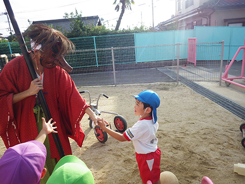 到着して遊んでいると、神様は来ないのに警護の天狗さんだけ登場
