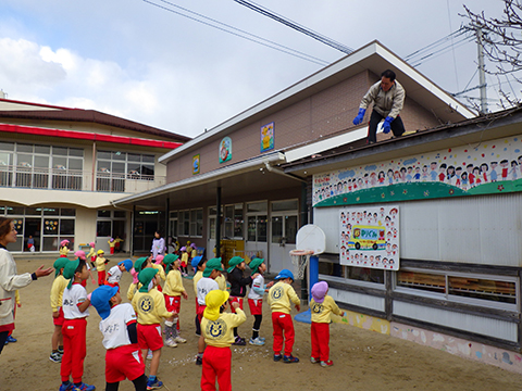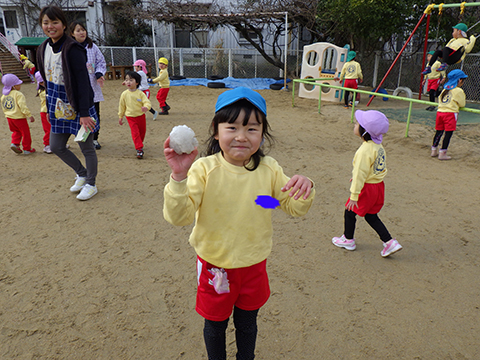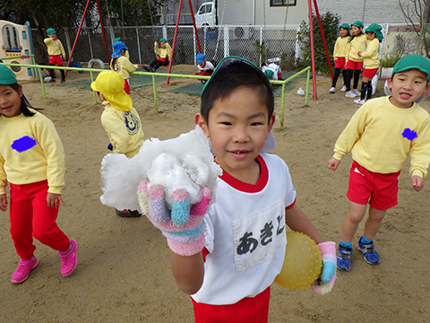 園庭にある雪だけじゃ足りないので、雪かき名人にも手伝ってもらいます。
