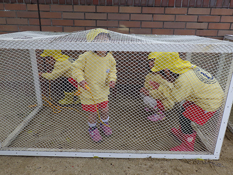 あまりの風の冷たさに、小屋に入ってみる年少児ですが、