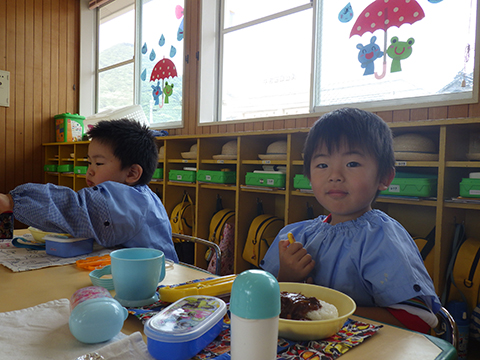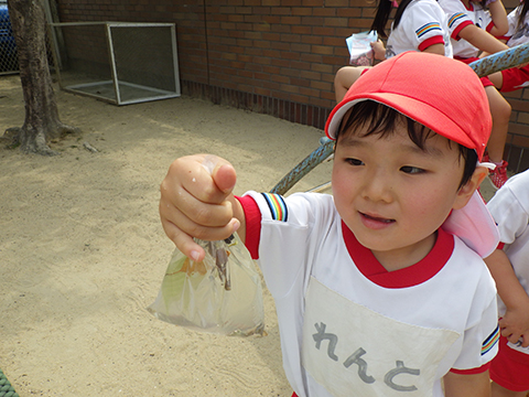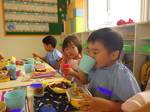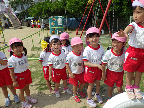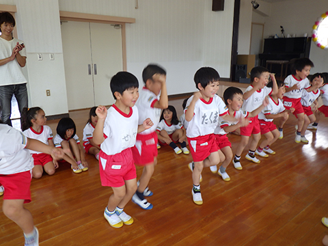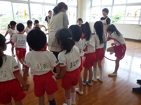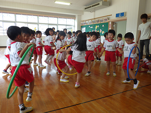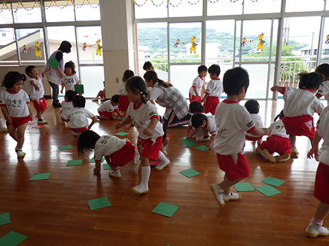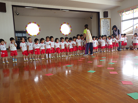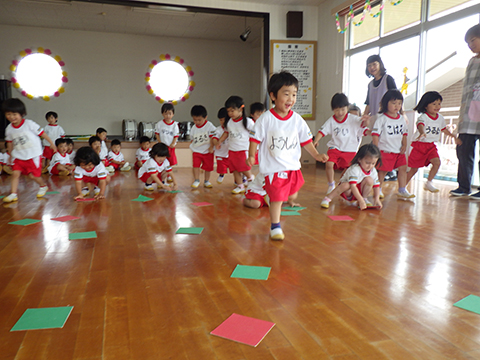 年少児、外で元気に遊んだあとは、おゆうぎ室に集合!