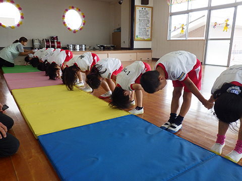 全員で手をつないで、一斉に前回り