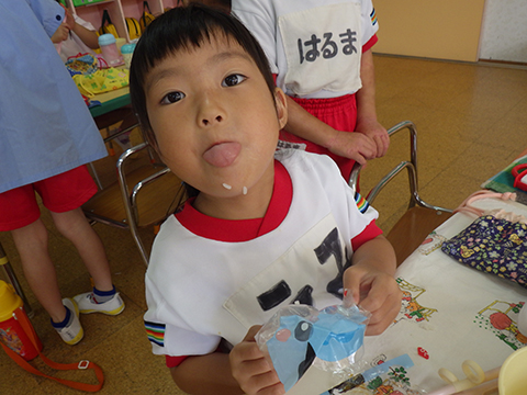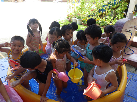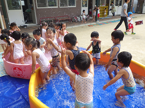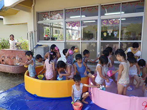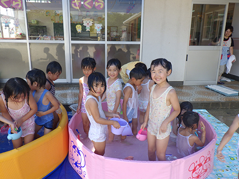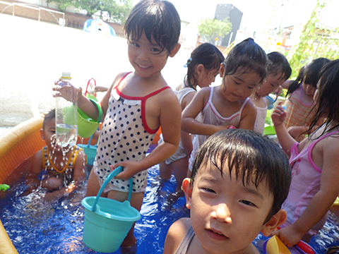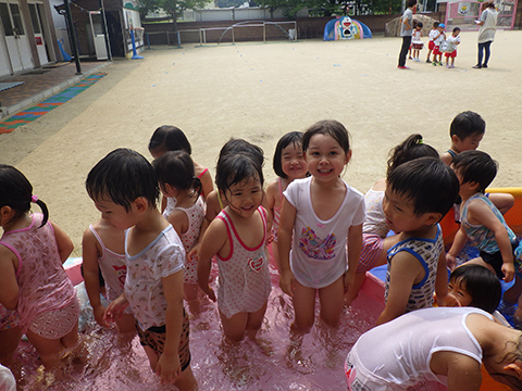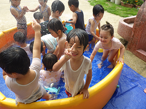 午前中、マーチングの練習を頑張った年長児は午後から水遊び