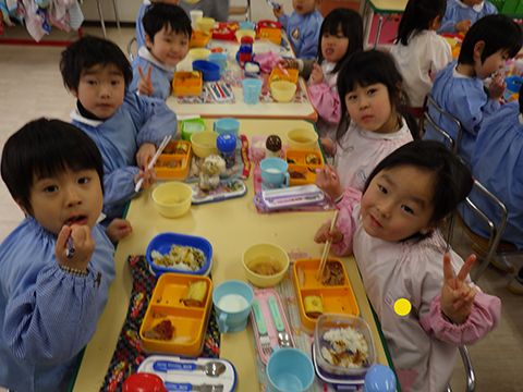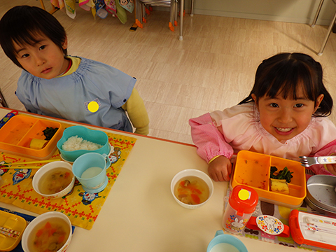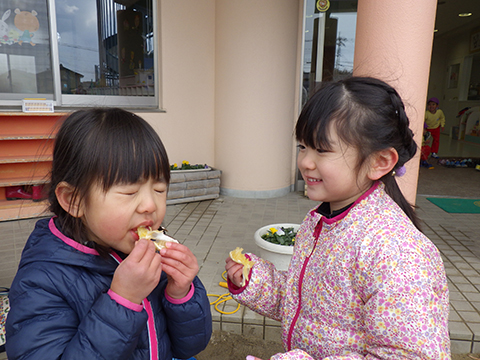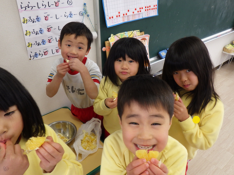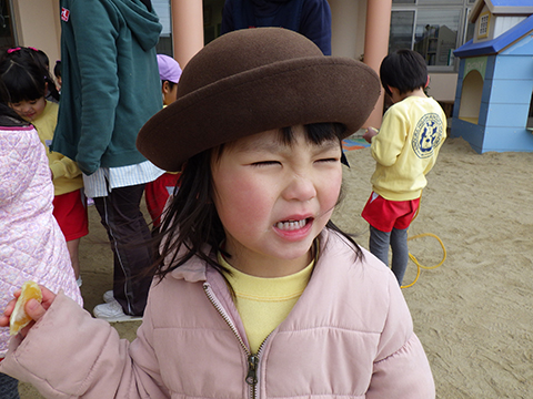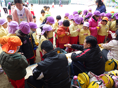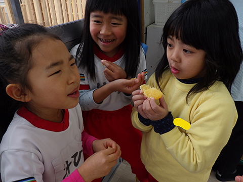 『友だちと一緒に幼稚園でみかんを食べる』