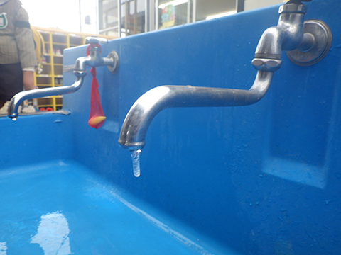 朝、仮園舎の水道で水が凍っていました
