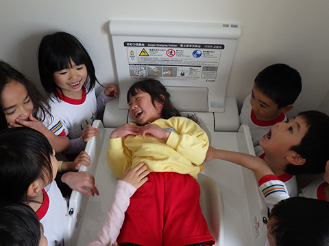 おむつ交換室では、まだ子どもなのにさらに童心にかえる姿が・・・。