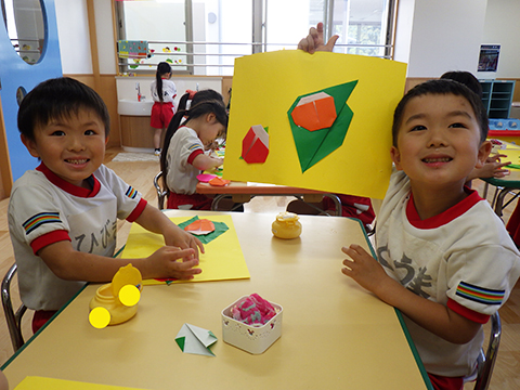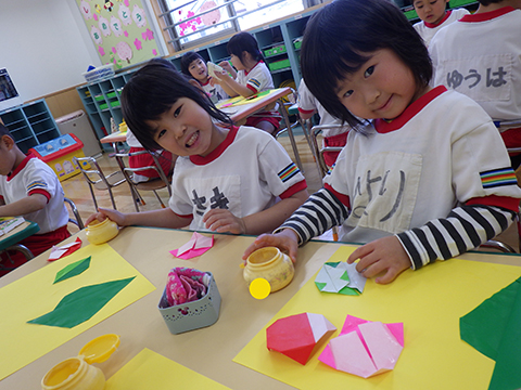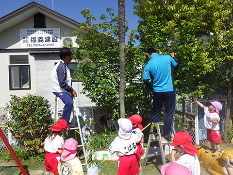 元気いっぱいであそぶ園児たちの横で名人たちが作業中
