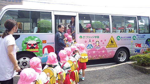 年中さんは、英語教室が終わると、バスに乗って東相浦幼稚園へ行きました。