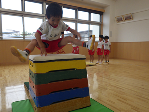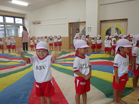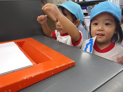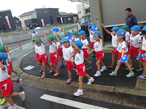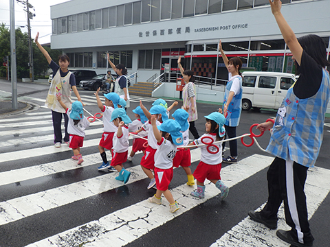 誘導ロープを使って、横断歩道はしっかり手を挙げて
