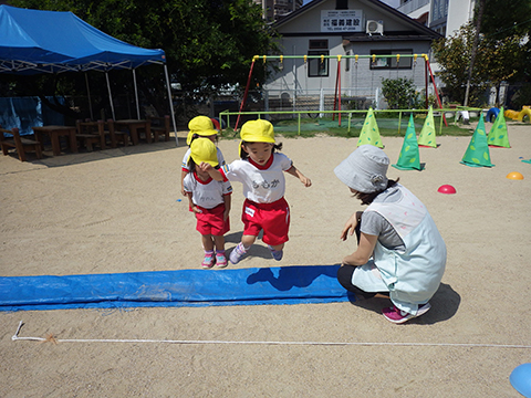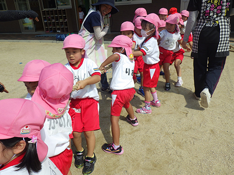 年少児は東相浦幼稚園のことりぐみを招いての障がい走