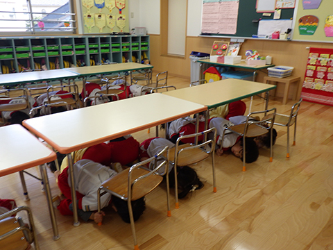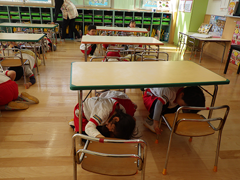 机の下に頭を隠し、揺れがおさまるまでじっと待ちます。