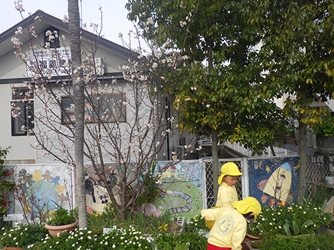 園庭のさくらんぼの樹がきれいな花を咲かせ、