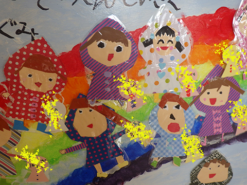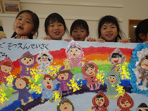 レインコートを着ててるてる坊主を持つ卒園児たち