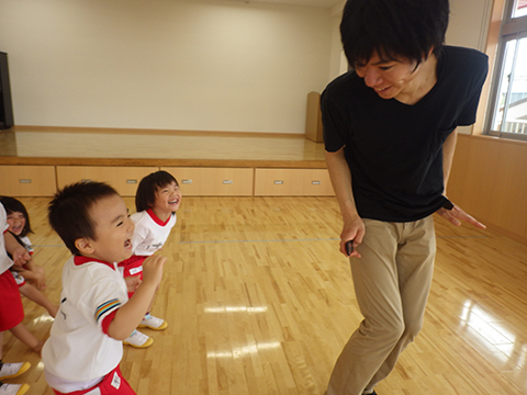 食後、広場で遊ぶときも今日は年中児が先輩として
