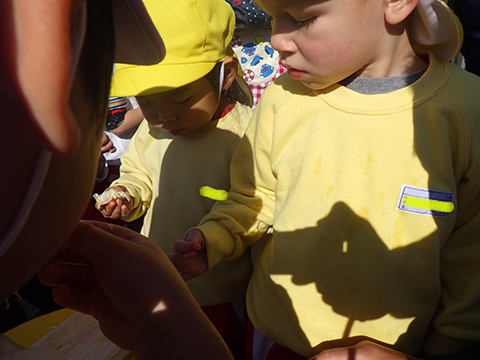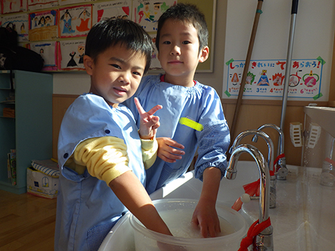明日は体操服登園、エプロン・三角巾・マスクの準備をお願いします