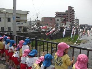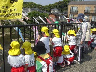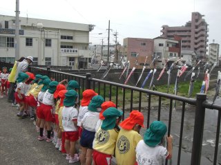 たくさんのこいのぼりと川を泳いでいる鯉にみんな夢中でした