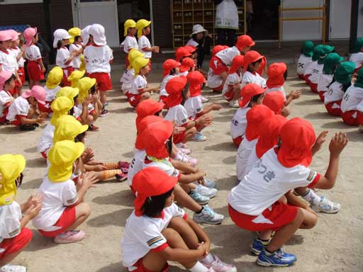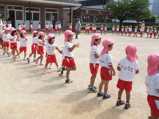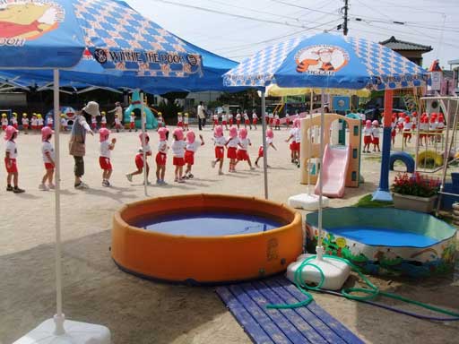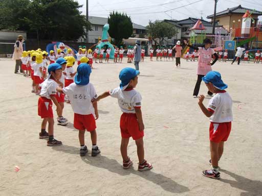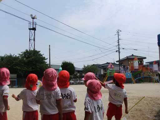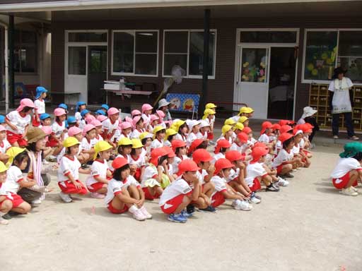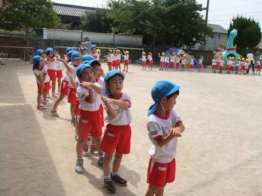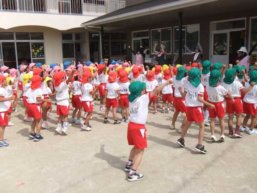 まず、朝は全員園庭に集まり夏祭りの予行練習から