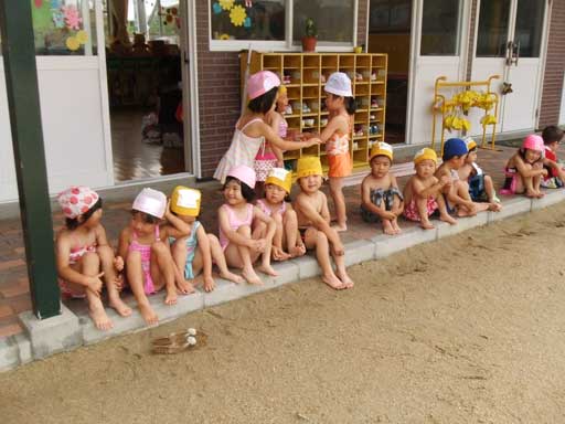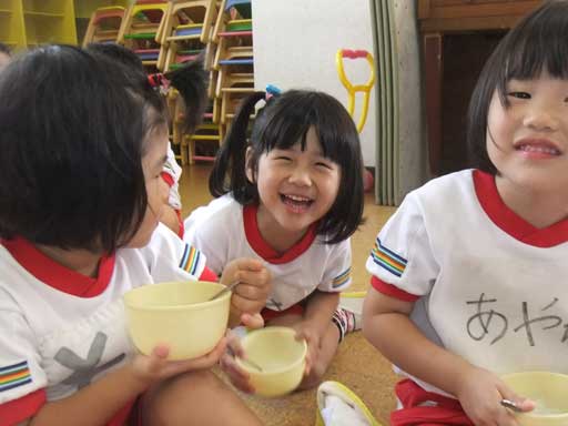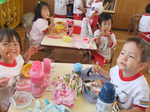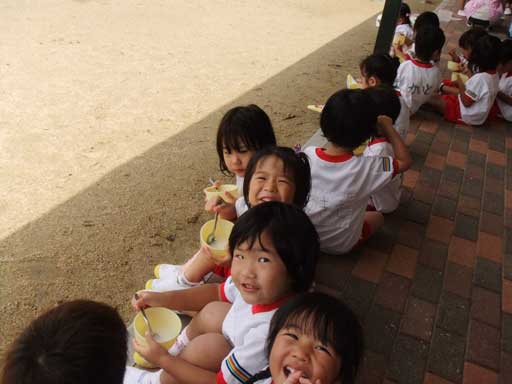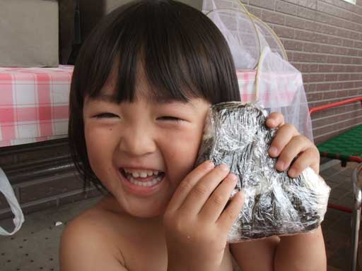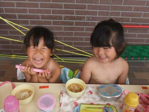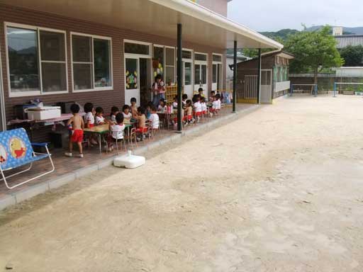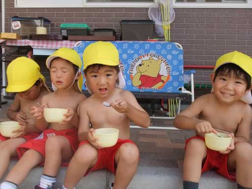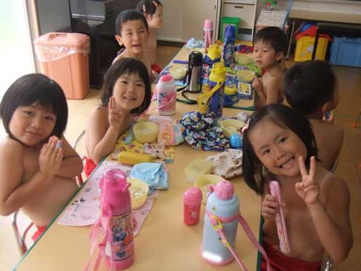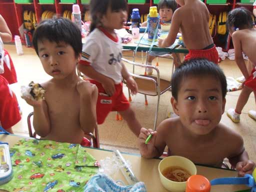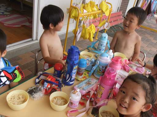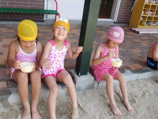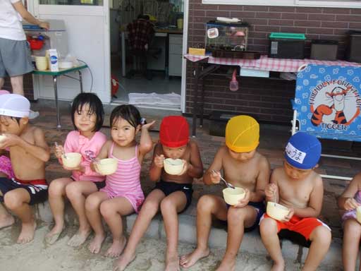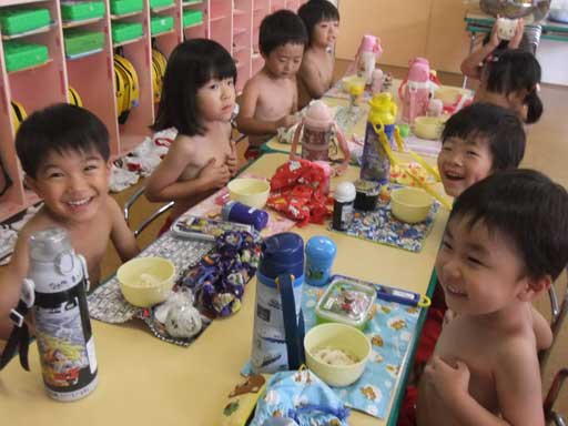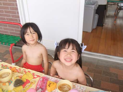 年少組さんは裸になって外で食べました
