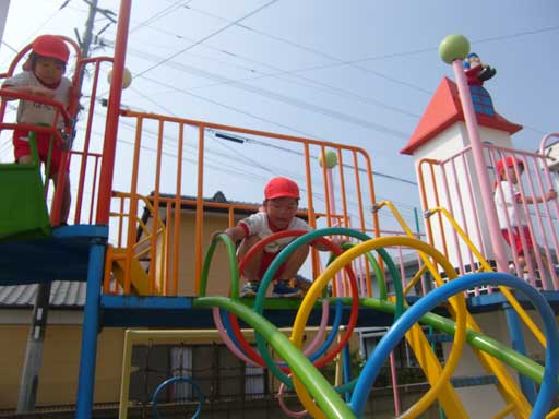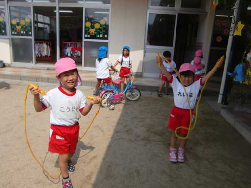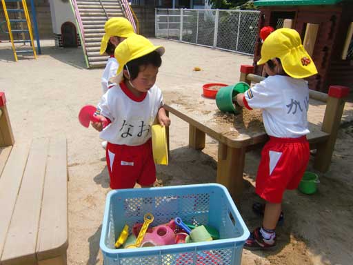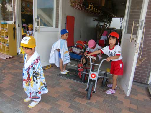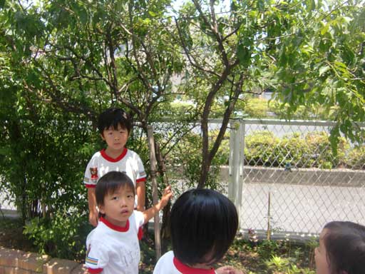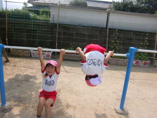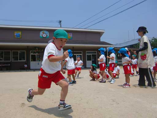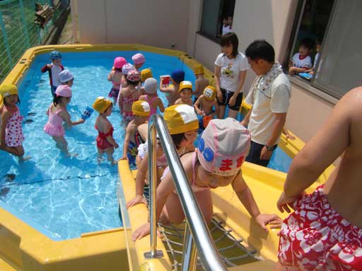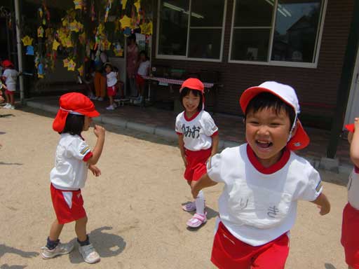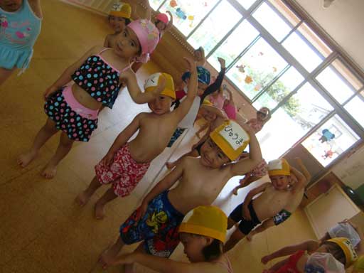 たくさん汗をかいて遊ぶ園児の中に、水着姿で写りこんだ年少組さん