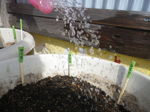 しっかり植えて土を被せて、水をあげて、日当たりのよい場所へ移動して、
