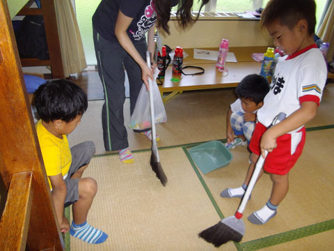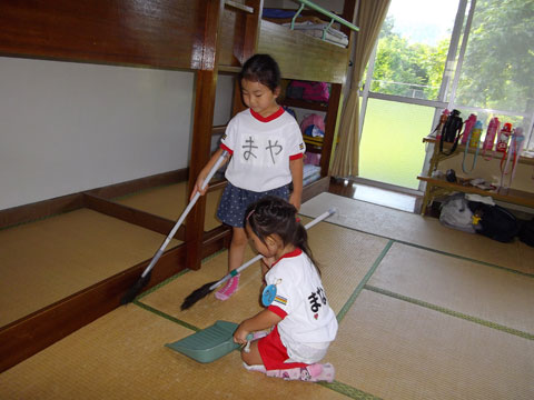 一晩過ごした部屋を全員で掃除中
