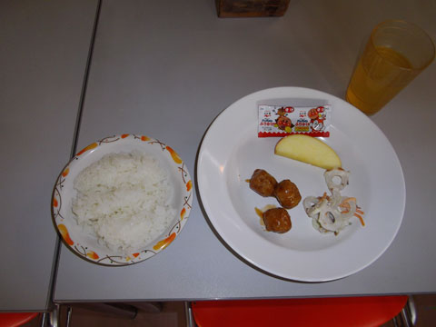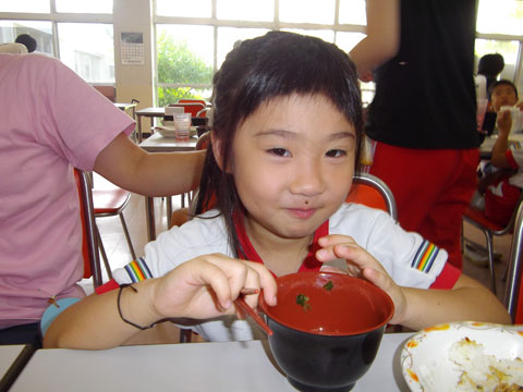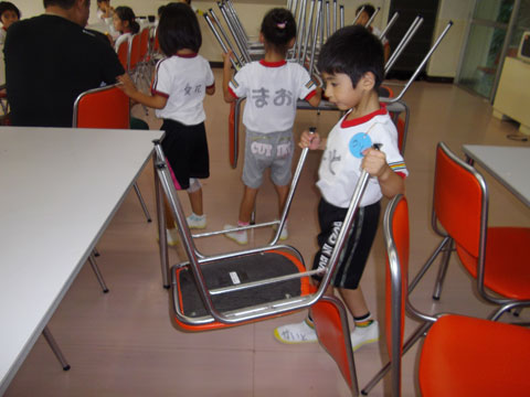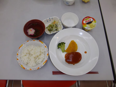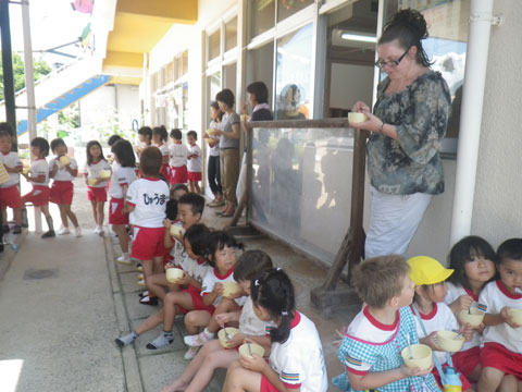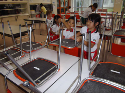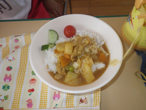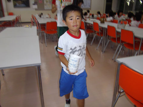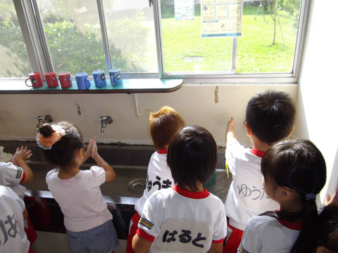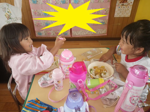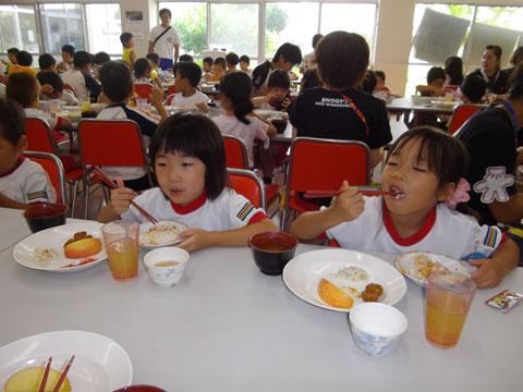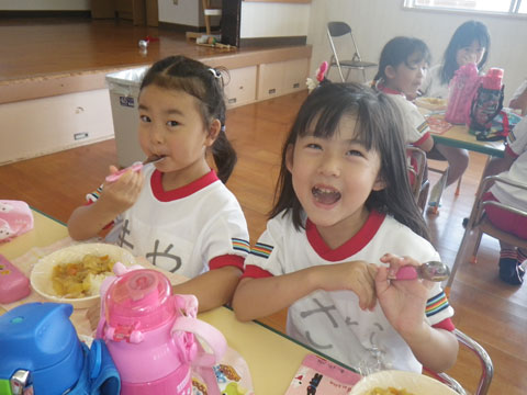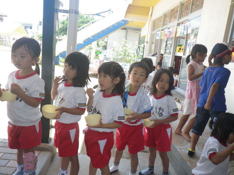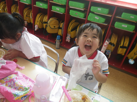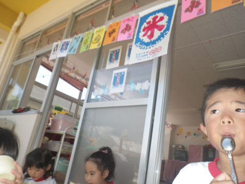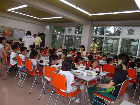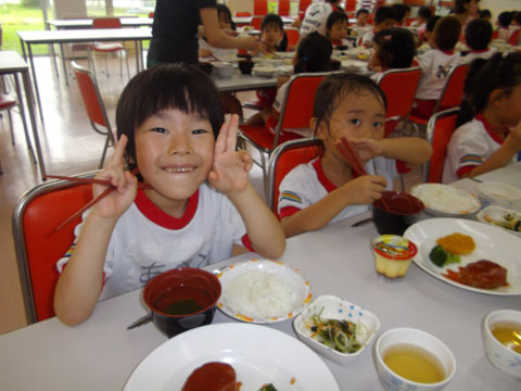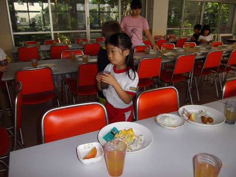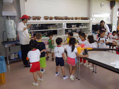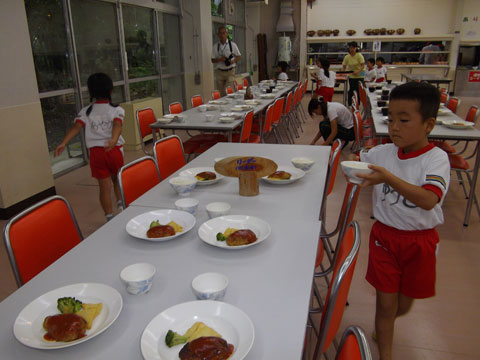 準備が終わるころ、手洗いを終えた園児たちが食堂へ集まり・・・、