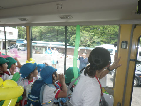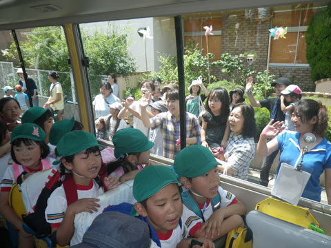 そしてお母さんたちに見送られながらバスへ乗り込み・・