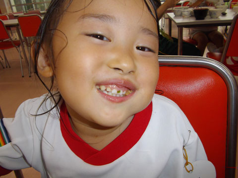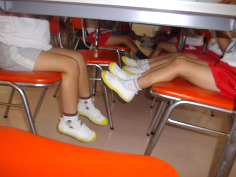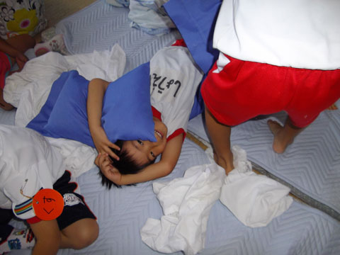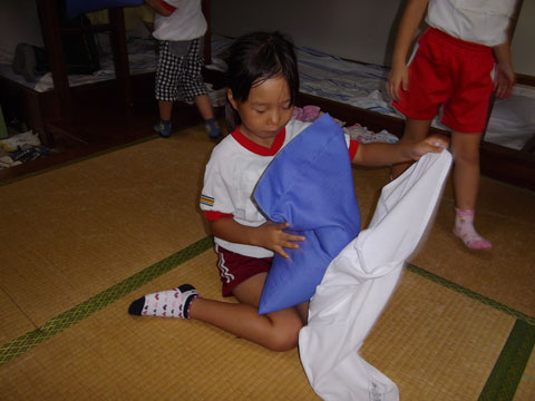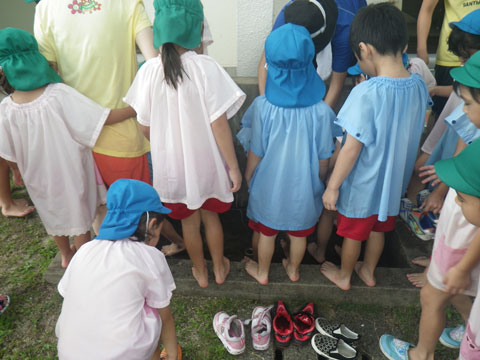 昼食後、体操服・靴下を脱いで、スモックを装着
