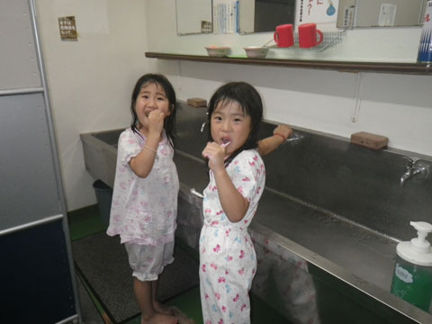 色とりどりのかわいいパジャマに着替えて順番に歯みがき