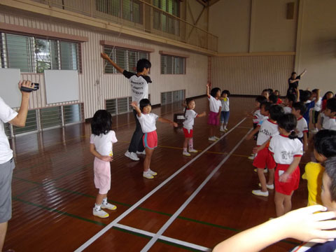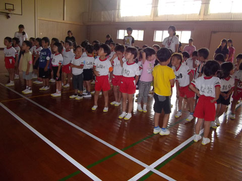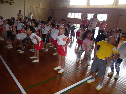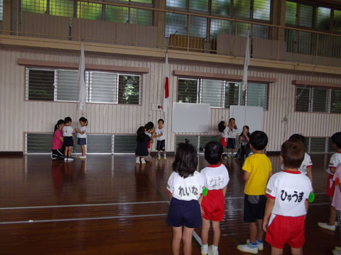 第11ラウンド〜朝のつどい〜体操服や、それぞれの服に着替え、プレイホール(体育館)へ集合