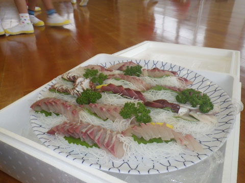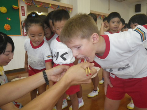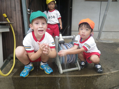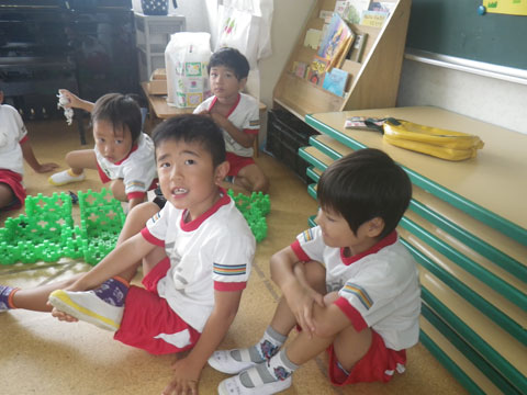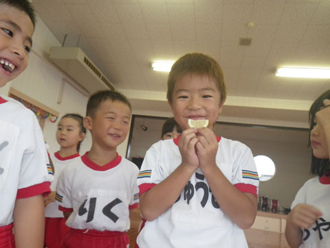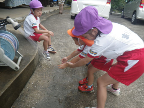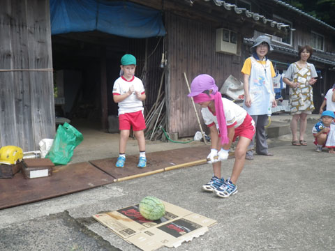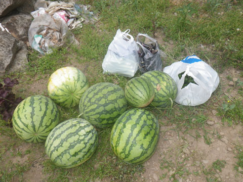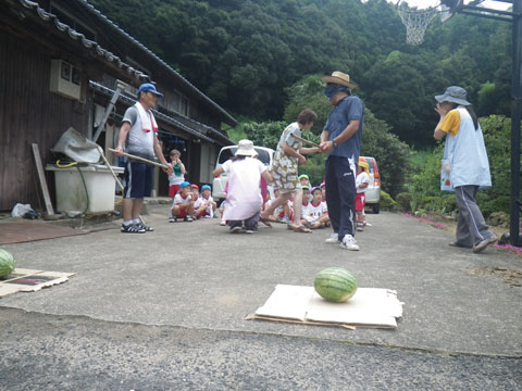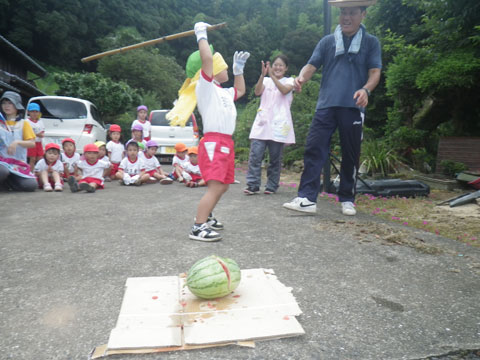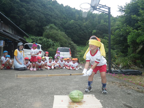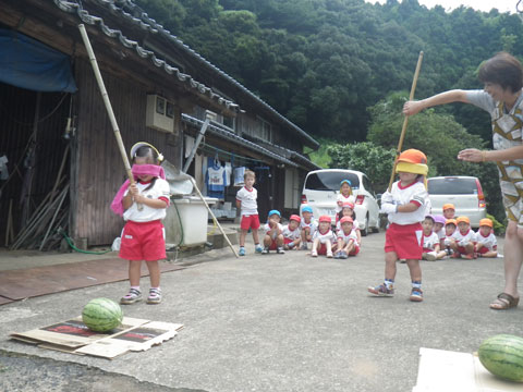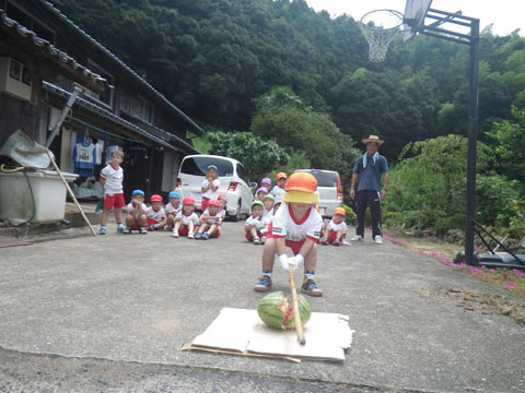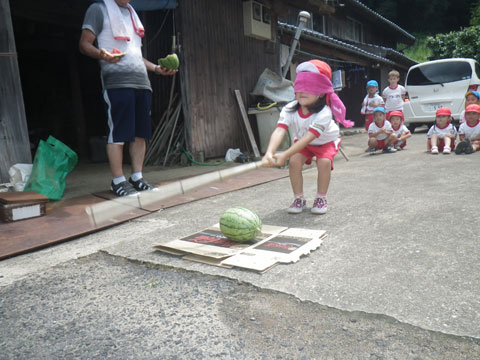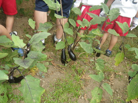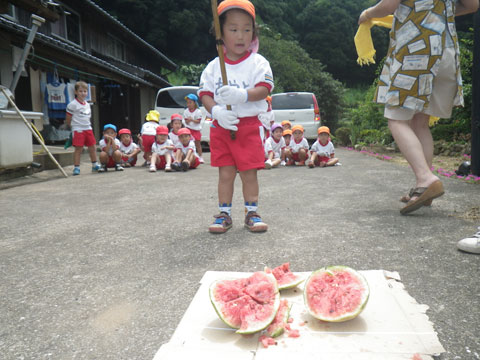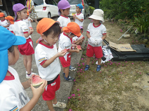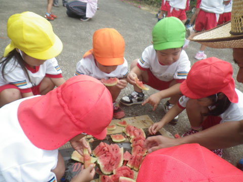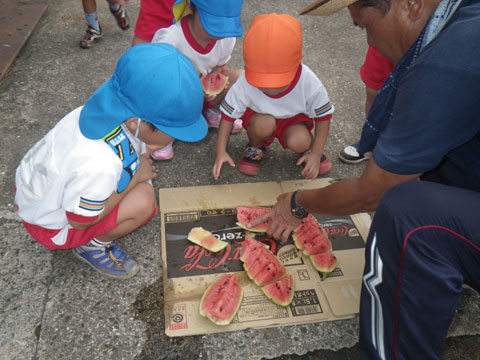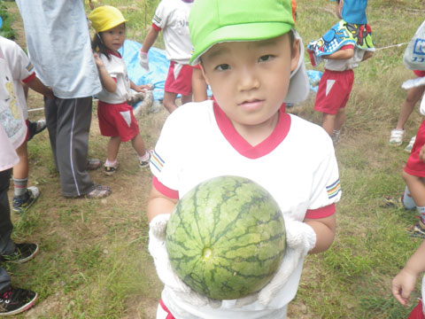 ちなみに・・、収穫した野菜・すいかは今日の預かり保育の園児で山分け