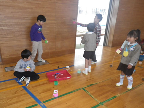 手作りのけんだま(資格に切った牛乳パックにまつぼっくり)に、