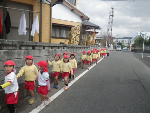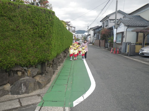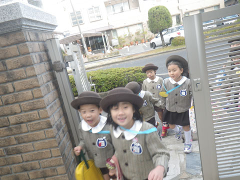 後ろから黄色い帽子、そのまた後ろから赤い帽子が便乗散歩