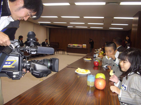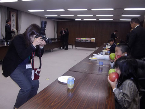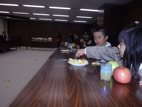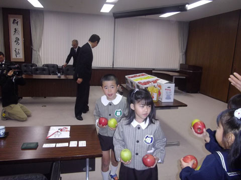 理事長よりりんごを受け取り、場の雰囲気に緊張しながらお礼を