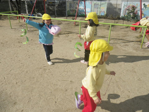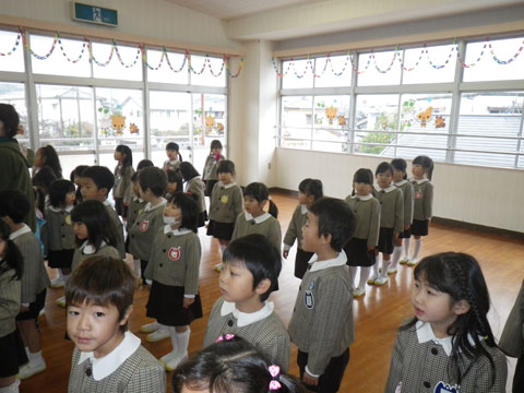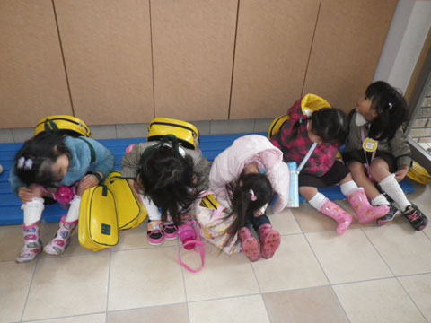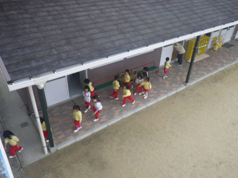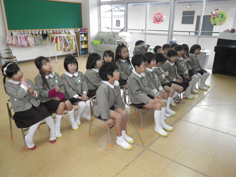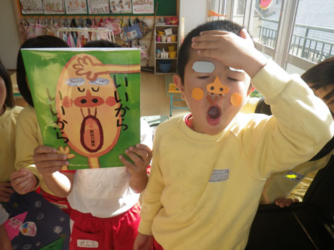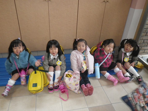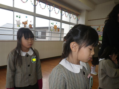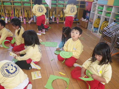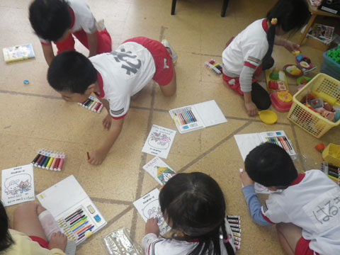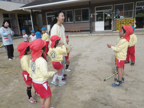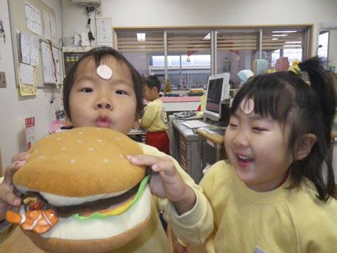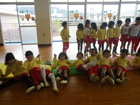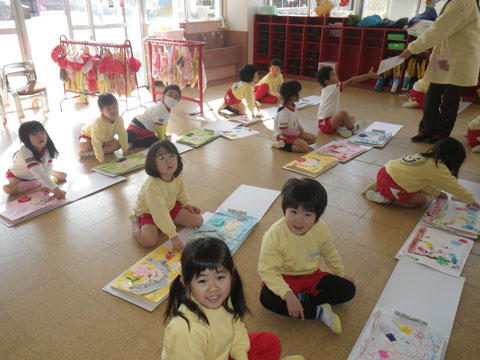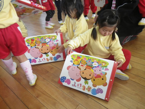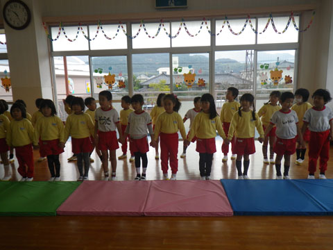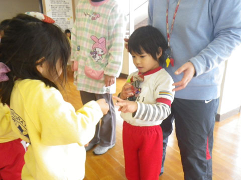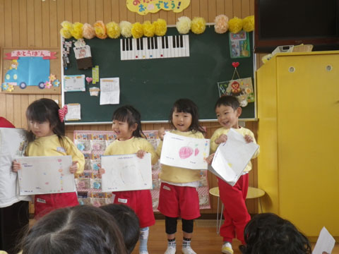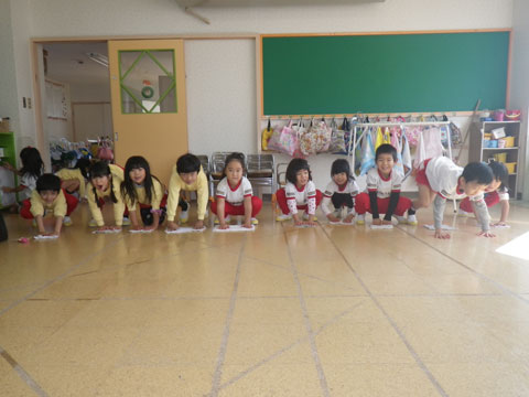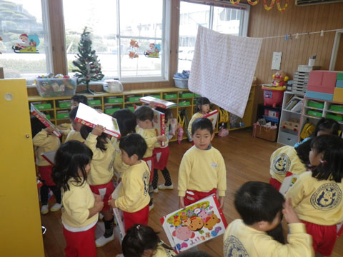 あいにくの小雨で園庭に出られなかったので、室内にて