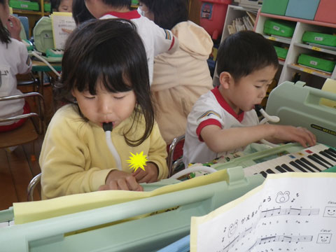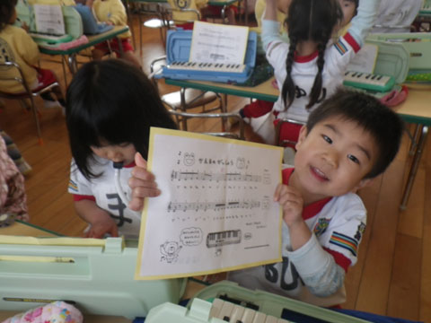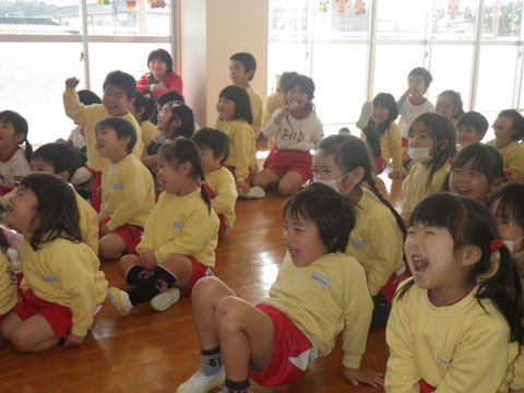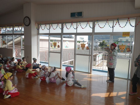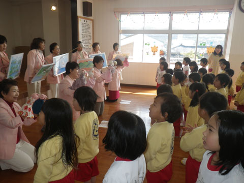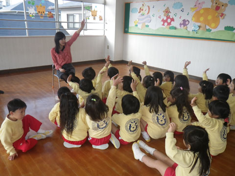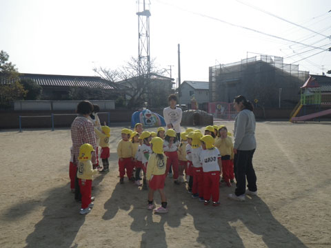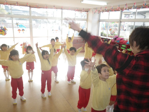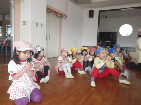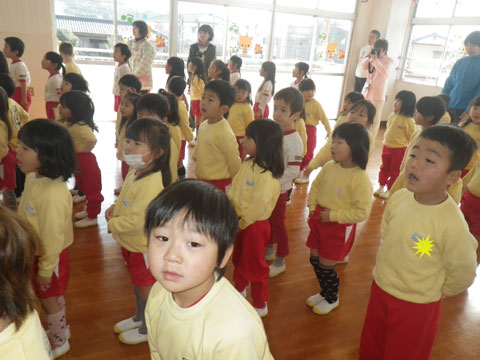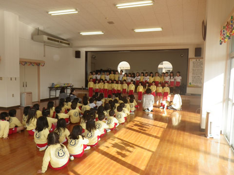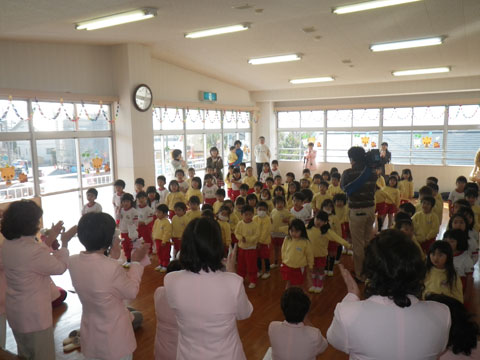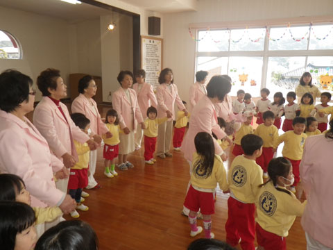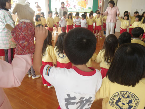 輪になって隣の人と手を繋ぎ、幼稚園で普段歌っている曲を合唱