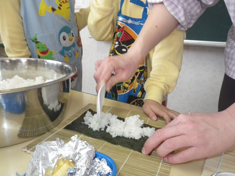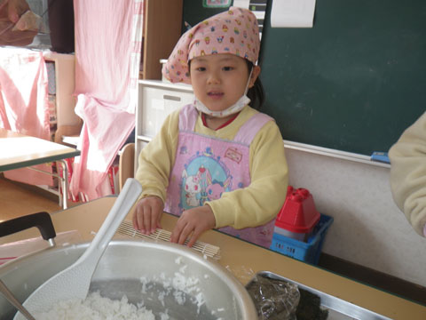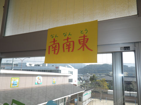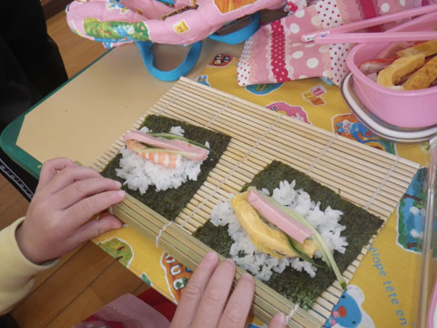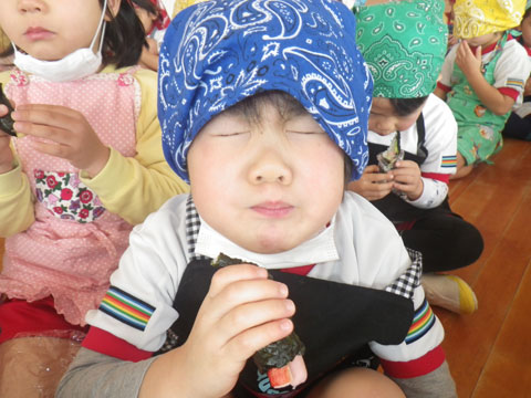後ろを向いて、恵方巻きの食べ方や意味について勉強中