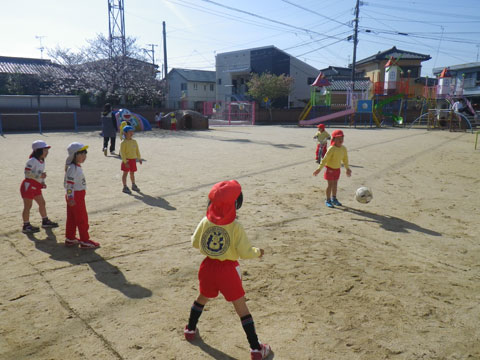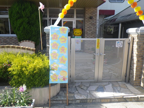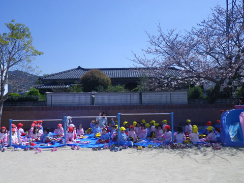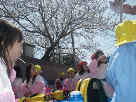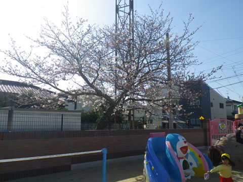 園庭の(正式には、園庭へ伸びている)桜の木も、徐々に咲き始め、