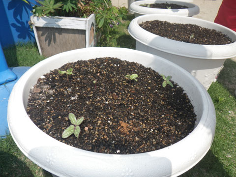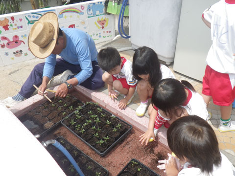 しゃぼん玉が落ち着いたら、名人の草花の育て方を見学。
