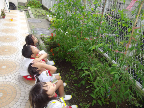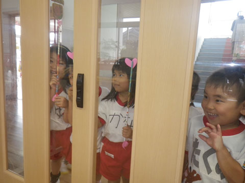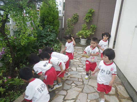 園庭に隠された“”と“”貼られたカードを探し、