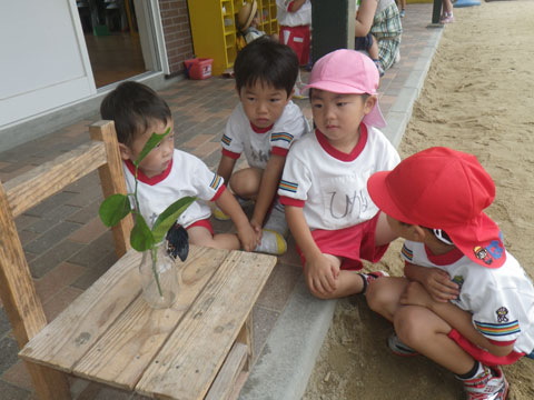 空を見上げる園児たち。